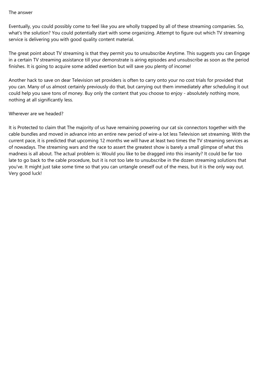The answer Eventually, you could possibly come to feel like you are wholly trapped by all of these streaming companies. So, what's the solution? You could potentially start with some organizing. Attempt to figure out which TV streaming service is delivering you with good quality content material. The great point about TV streaming is that they permit you to unsubscribe Anytime. This suggests you can Engage in a certain TV streaming assistance till your demonstrate is airing episodes and unsubscribe as soon as the period finishes. It is going to acquire some added exertion but will save you plenty of income! Another hack to save on dear Television set providers is often to carry onto your no cost trials for provided that you can. Many of us almost certainly previously do that, but carrying out them immediately after scheduling it out could help you save tons of money. Buy only the content that you choose to enjoy - absolutely nothing more, nothing at all significantly less. Wherever are we headed? It is Protected to claim that The majority of us have remaining powering our cat six connectors together with the cable bundles and moved in advance into an entire new period of wire-a lot less Television set streaming. With the current pace, it is predicted that upcoming 12 months we will have at least two times the TV streaming services as of nowadays. The streaming wars and the race to assert the greatest show is barely a small glimpse of what this madness is all about. The actual problem is: Would you like to be dragged into this insanity? It could be far too late to go back to the cable procedure, but it is not too late to unsubscribe in the dozen streaming solutions that you've. It might just take some time so that you can untangle oneself out of the mess, but it is the only way out. Very good luck!