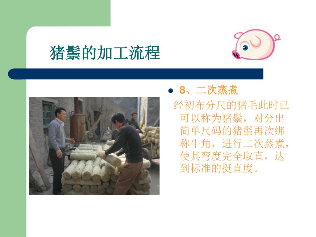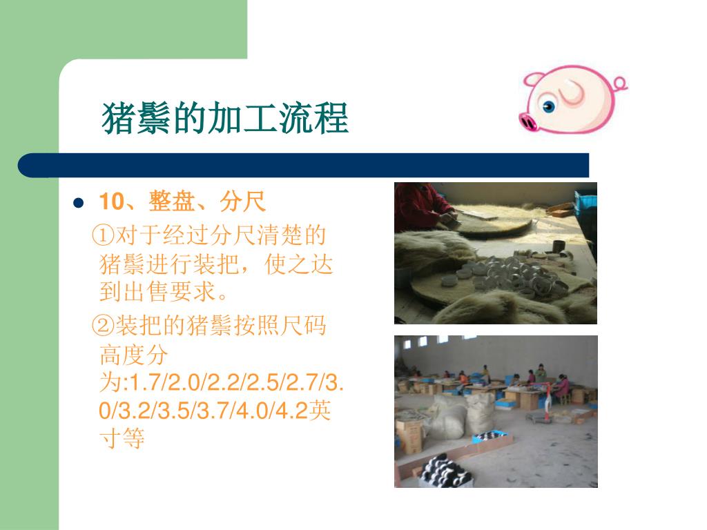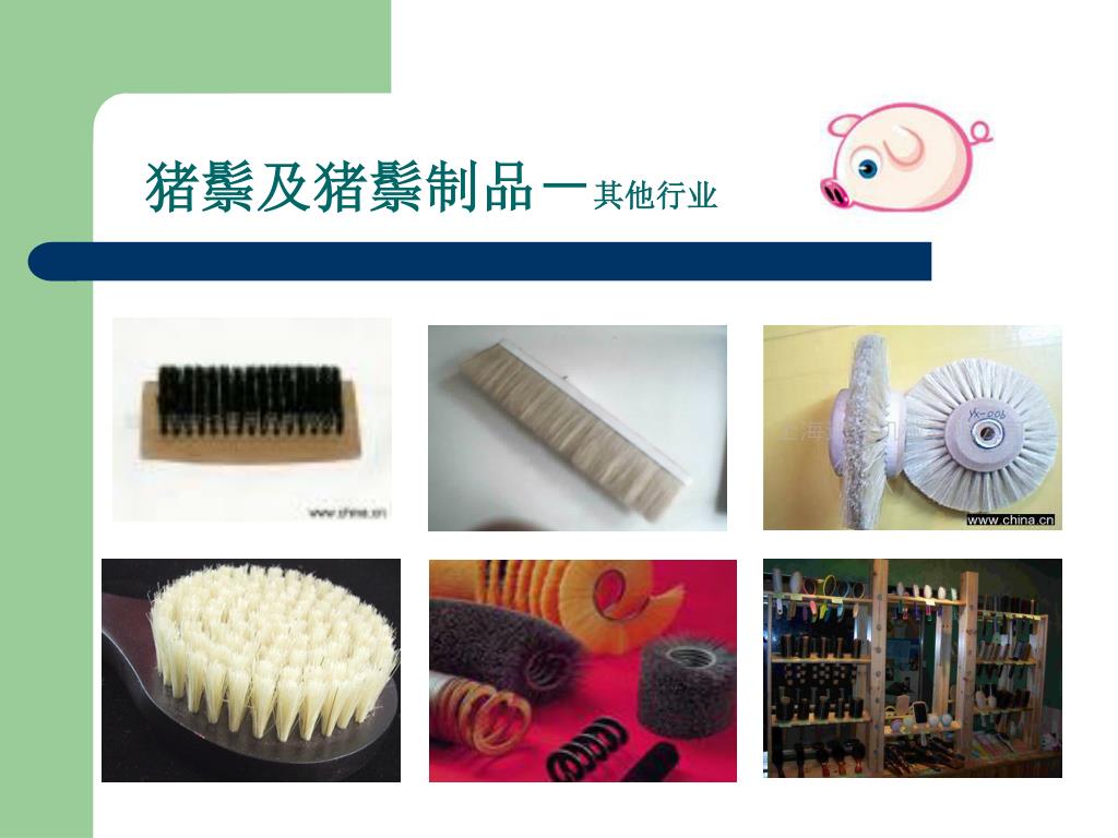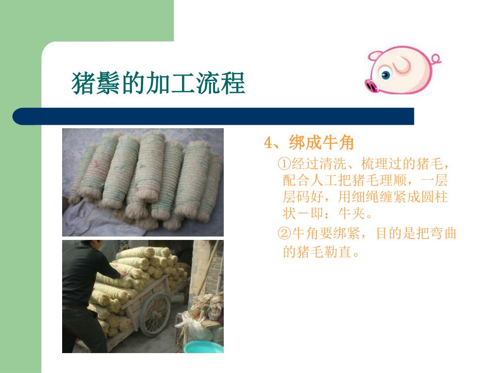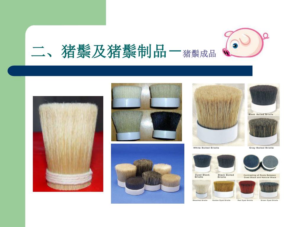 --嘉祥县胜图猪鬃机械厂. 猪鬃加工流程讲解. 0537-6971253 www.zzjxc.com. 一、猪鬃的特点. 1 、猪鬃由猪身上的毛加工而成,在广大农村猪屠宰后,认为猪毛没有价值,大多丢弃。 2 、其实猪鬃作为我国出口创汇的重要畜产品之一,我国的猪鬃出口占领国际猪鬃市场的 95 %。 3 、猪鬃具有耐高温、耐低温、耐酸碱等特点 4 、应用于印染、纺织、军事、化工、医药等行业 。. 二、猪鬃及猪鬃制品- 猪鬃成品. 猪鬃及猪鬃制品- 油漆刷. 猪鬃及猪鬃制品- 化妆刷. 猪鬃及猪鬃制品- 卫生刷. 猪鬃及猪鬃制品- 其他行业. 三、猪鬃的加工流程.