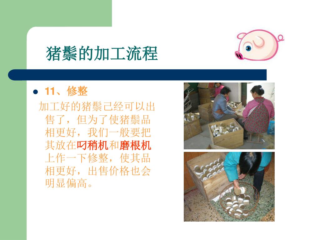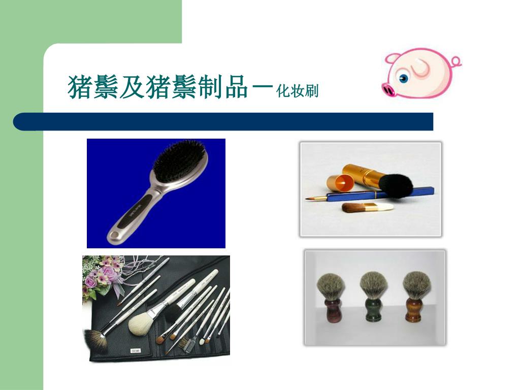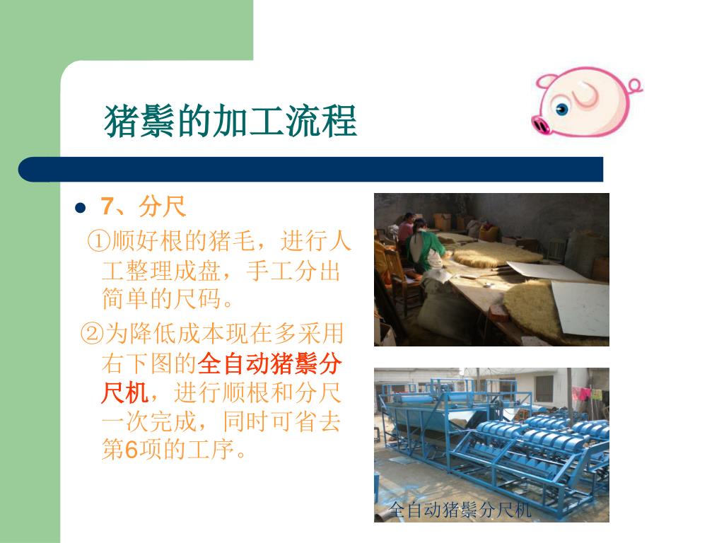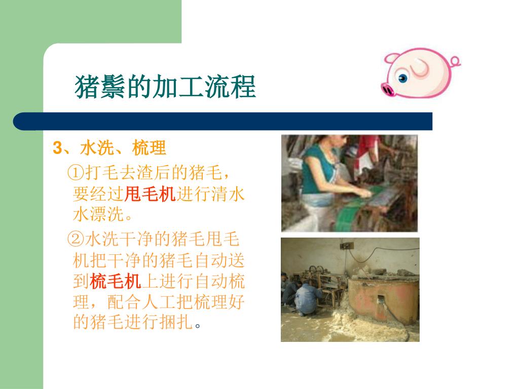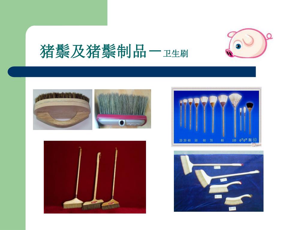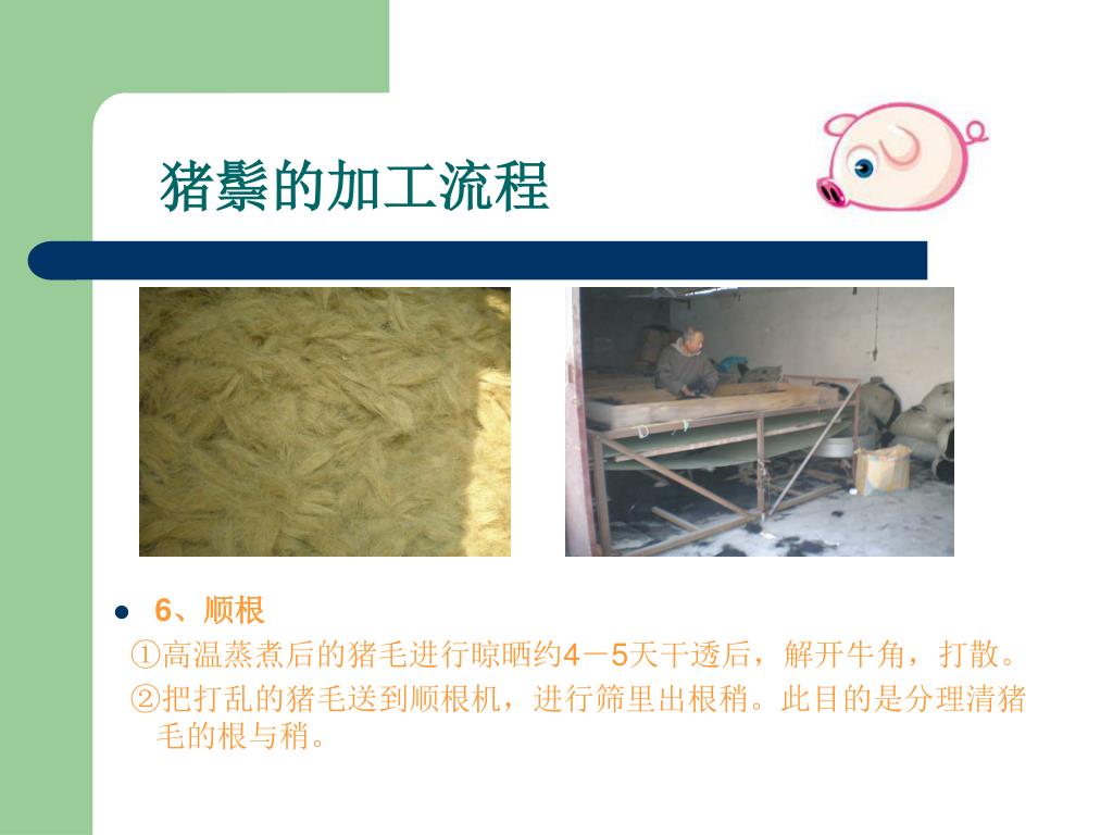 --嘉祥县胜图猪鬃机械厂. 猪鬃加工流程讲解. 0537-6971253 www.zzjxc.com. 一、猪鬃的特点. 1 、猪鬃由猪身上的毛加工而成,在广大农村猪屠宰后,认为猪毛没有价值,大多丢弃。 2 、其实猪鬃作为我国出口创汇的重要畜产品之一,我国的猪鬃出口占领国际猪鬃市场的 95 %。 3 、猪鬃具有耐高温、耐低温、耐酸碱等特点 4 、应用于印染、纺织、军事、化工、医药等行业 。. 二、猪鬃及猪鬃制品- 猪鬃成品. 猪鬃及猪鬃制品- 油漆刷. 猪鬃及猪鬃制品- 化妆刷. 猪鬃及猪鬃制品- 卫生刷. 猪鬃及猪鬃制品- 其他行业. 三、猪鬃的加工流程.