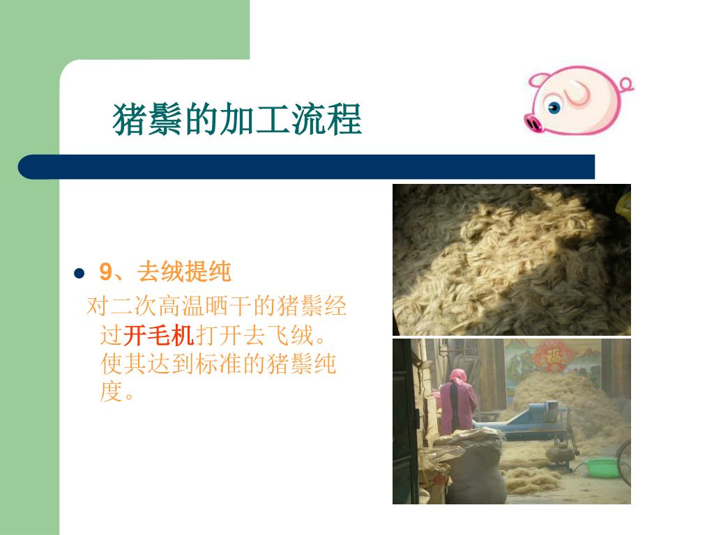 猪鬃的加工流程 • 9、去绒提纯 对二次高温晒干的猪鬃经过开毛机打开去飞绒。使其达到标准的猪鬃纯度。