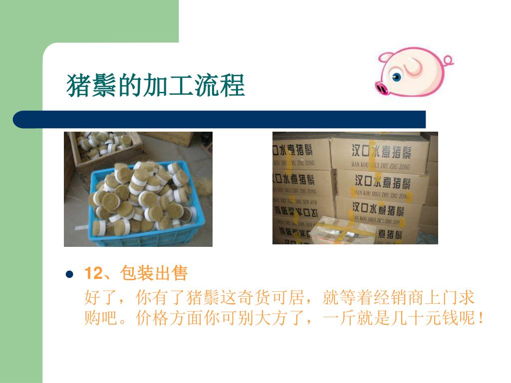 猪鬃的加工流程 • 12、包装出售 好了,你有了猪鬃这奇货可居,就等着经销商上门求购吧。价格方面你可别大方了,一斤就是几十元钱呢!
