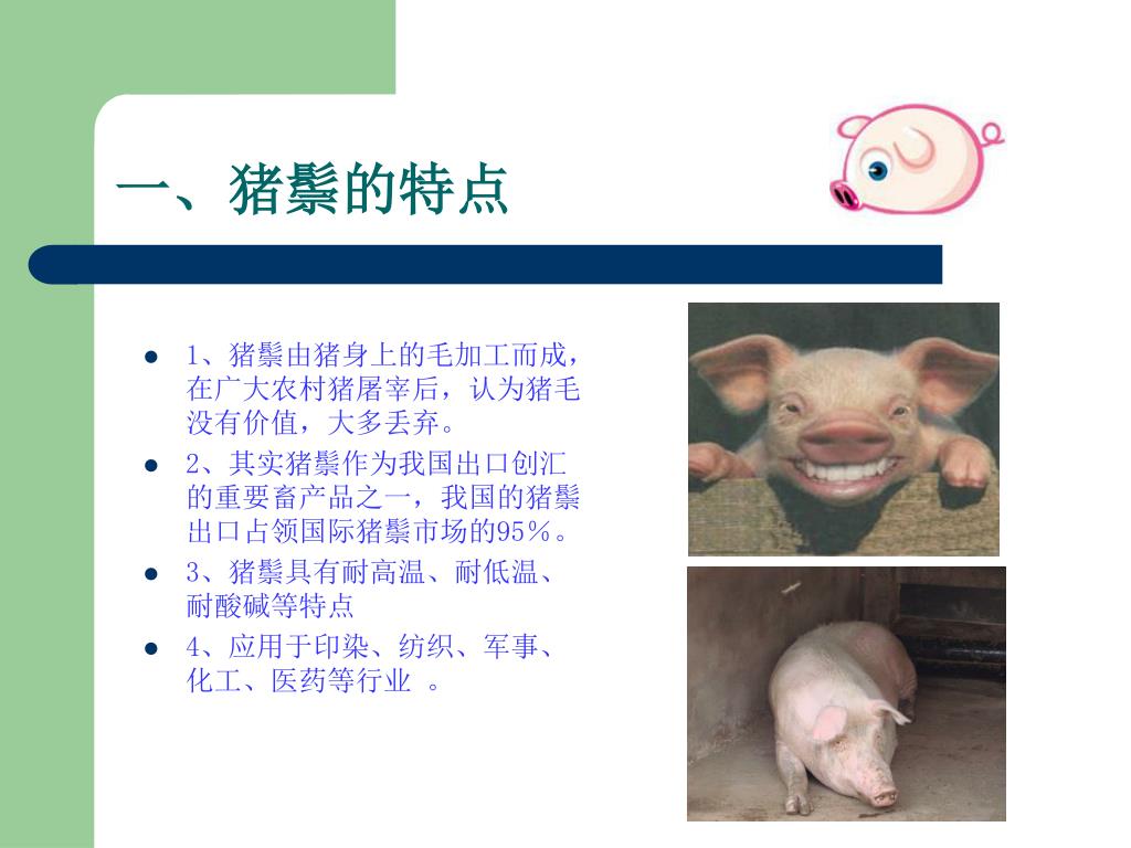 一、猪鬃的特点 • 1、猪鬃由猪身上的毛加工而成,在广大农村猪屠宰后,认为猪毛没有价值,大多丢弃。 • 2、其实猪鬃作为我国出口创汇的重要畜产品之一,我国的猪鬃出口占领国际猪鬃市场的95%。 • 3、猪鬃具有耐高温、耐低温、耐酸碱等特点 • 4、应用于印染、纺织、军事、化工、医药等行业 。