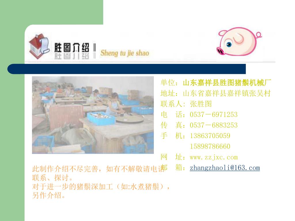单位:山东嘉祥县胜图猪鬃机械厂 地址:山东省嘉祥县嘉祥镇张吴村 联系人: 张胜图 电 话:0537-6971253 传 真:0537-6883253 手 机:13863705059 15898786660 网 址:www.zzjxc.com 邮 箱:zhangzhaoli@163.com 此制作介绍不尽完善,如有不解敬请电话 联系、探讨。 对于进一步的猪鬃深加工(如:水煮猪鬃), 另作介绍。