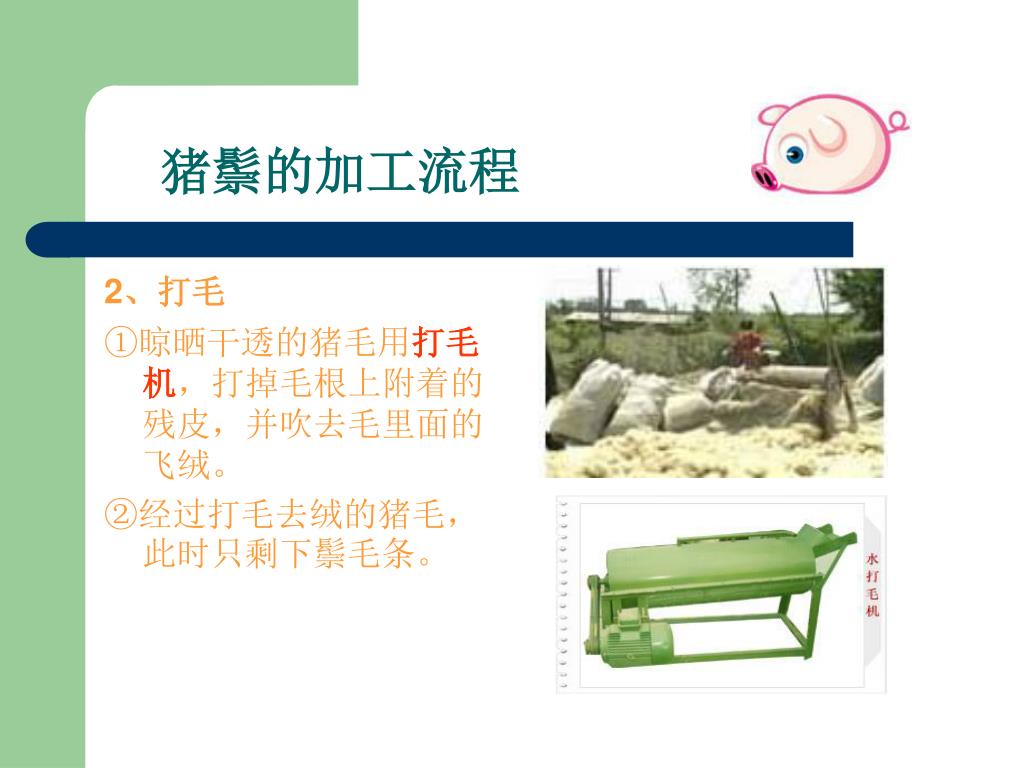 猪鬃的加工流程 2、打毛 ①晾晒干透的猪毛用打毛机,打掉毛根上附着的残皮,并吹去毛里面的飞绒。 ②经过打毛去绒的猪毛,此时只剩下鬃毛条。
