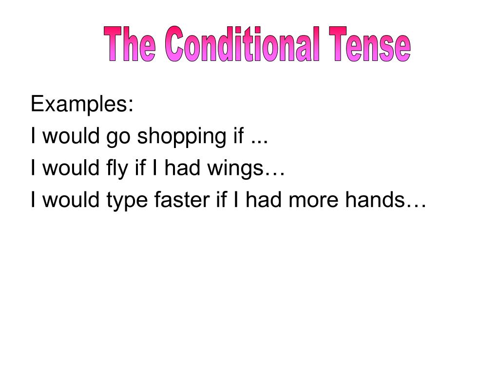 The Conditional Tense Examples: I would go shopping if ... I would fly if I had wings… I would type faster if I had more hands…