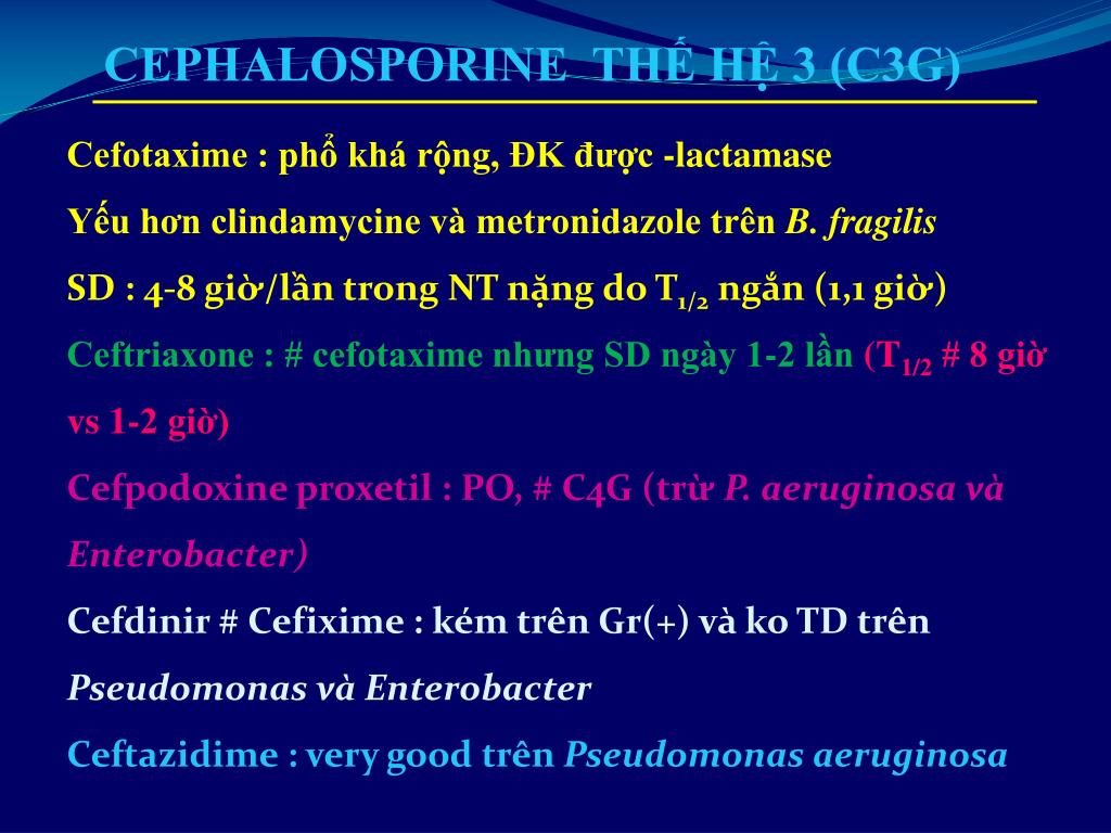 CEPHALOSPORINE THẾ HỆ 3 (C3G) Cefotaxime : phổ khá rộng, ĐK được -lactamase Yếu hơn clindamycine và metronidazole trên B. fragilis SD : 4-8 giờ/lầntrong NT nặng do T1/2ngắn (1,1 giờ) Ceftriaxone : # cefotaxime nhưng SD ngày 1-2 lần(T1/2 # 8 giờ vs 1-2 giờ) Cefpodoxineproxetil : PO, # C4G (trừP. aeruginosavàEnterobacter) Cefdinir # Cefixime : kémtrênGr(+) vàko TD trênPseudomonas vàEnterobacter Ceftazidime : very good trênPseudomonas aeruginosa