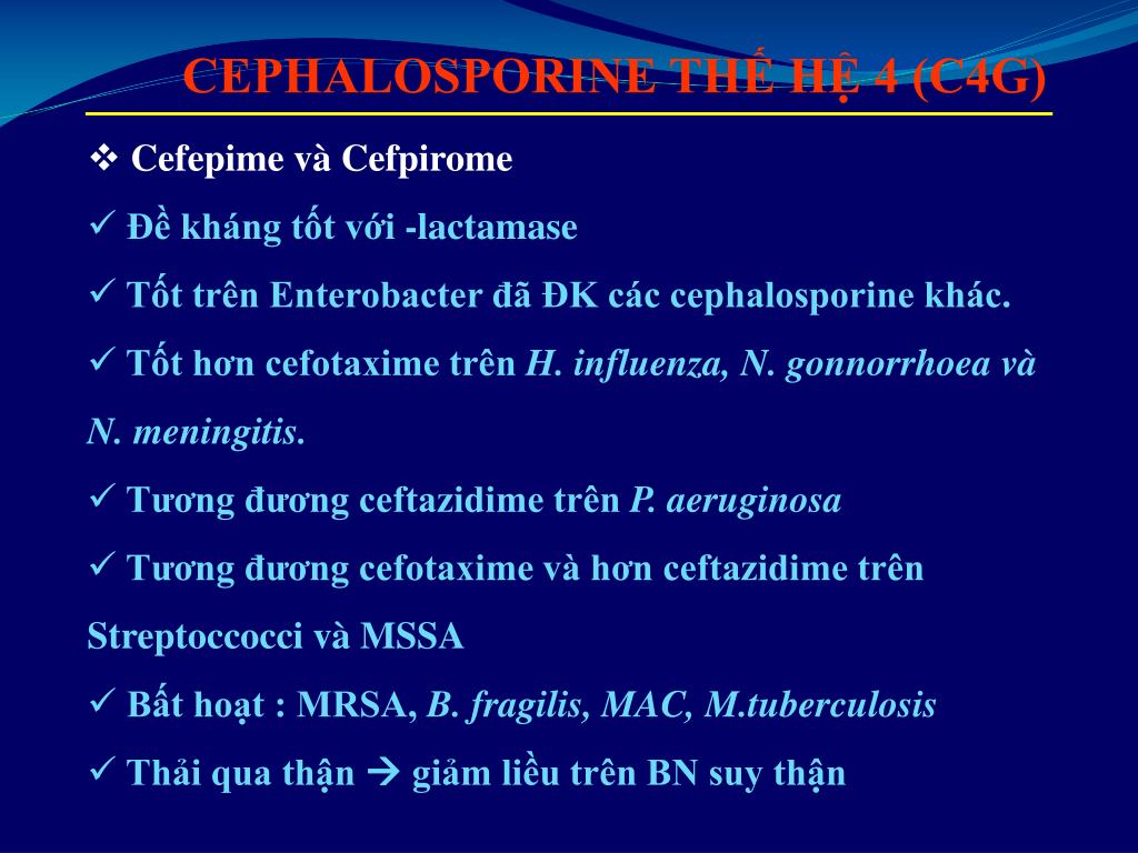 CEPHALOSPORINE THẾ HỆ 4 (C4G) • Cefepime và Cefpirome • Đề kháng tốt với -lactamase • Tốt trên Enterobacter đã ĐK các cephalosporine khác. • Tốt hơn cefotaxime trên H. influenza, N. gonnorrhoea và N. meningitis. • Tương đương ceftazidime trên P. aeruginosa • Tương đương cefotaxime và hơn ceftazidime trên Streptoccocci và MSSA • Bất hoạt : MRSA, B. fragilis, MAC, M.tuberculosis • Thải qua thận giảm liều trên BN suy thận