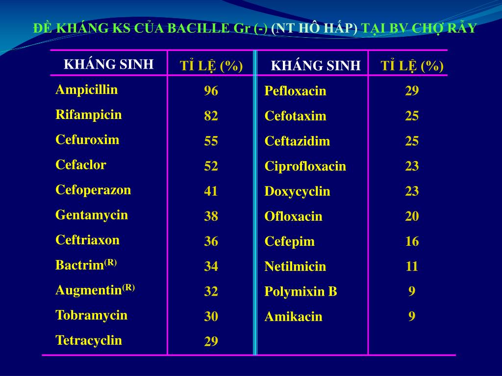 ĐỀ KHÁNG KS CỦA BACILLE Gr (-) (NT HÔ HẤP) TẠI BV CHỢ RẪY KHÁNG SINH Ampicillin Rifampicin Cefuroxim Cefaclor Cefoperazon Gentamycin Ceftriaxon Bactrim(R) Augmentin(R) Tobramycin Tetracyclin TỈ LỆ (%) 96 82 55 52 41 38 36 34 32 30 29 KHÁNG SINH Pefloxacin Cefotaxim Ceftazidim Ciprofloxacin Doxycyclin Ofloxacin Cefepim Netilmicin Polymixin B Amikacin TỈ LỆ (%) 29 25 25 23 23 20 16 11 9 9