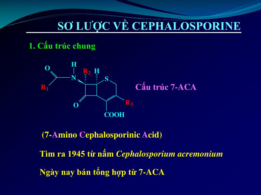 CEPHALOSPORINE. SÖÛ DUÏNG VAØ LÖU YÙ. PGS.TS. LEÂ MINH TRÍ. SƠ LƯỢC VỀ CEPHALOSPORINE. 1. Cấu trúc chung. Cấu trúc 7-ACA. (7- A mino C ephalosporinic A cid). Tìm ra 1945 từ nấm Cephalosporium acremonium Ngày nay bán tổng hợp từ 7-ACA. CƠ CHẾ TÁC ĐỘNG.
