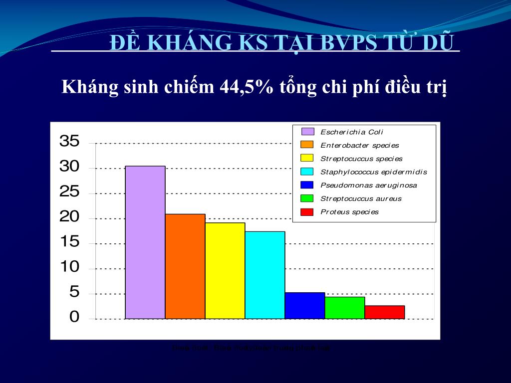 ĐỀ KHÁNG KS TẠI BVPS TỪ DŨ Kháng sinh chiếm 44,5% tổng chi phí điều trị TÆ LEÄ VK PHAÂN LAÄP ÑÖÔÏC E. coli Enterob St. Sta. Pseu St.aureus Proteus