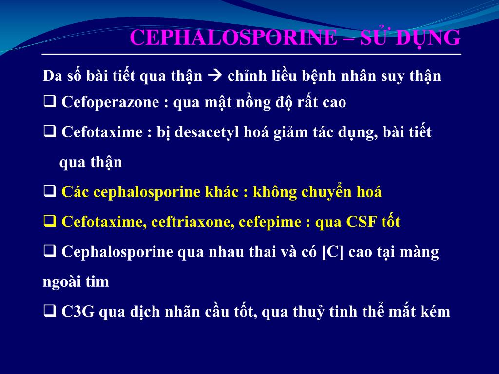 CEPHALOSPORINE – SỬ DỤNG • Đa số bài tiết qua thận chỉnh liều bệnh nhân suy thận • Cefoperazone : qua mật nồng độ rất cao • Cefotaxime : bị desacetyl hoá giảm tác dụng, bài tiết • qua thận • Các cephalosporine khác : không chuyển hoá • Cefotaxime, ceftriaxone, cefepime : qua CSF tốt • Cephalosporine qua nhau thai và có [C] cao tại màng ngoài tim • C3G qua dịch nhãn cầu tốt, qua thuỷ tinh thể mắt kém