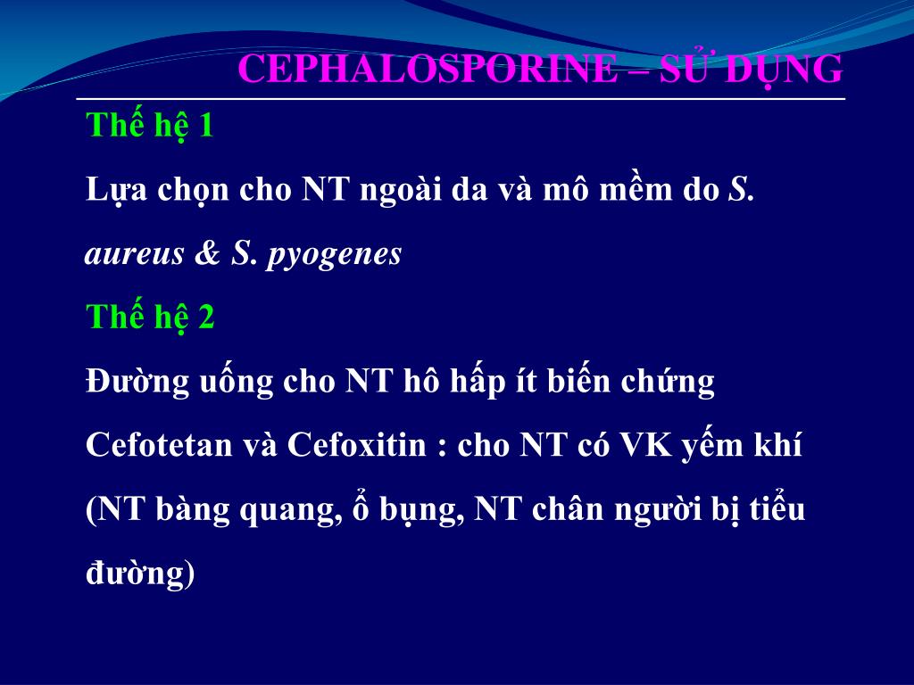 CEPHALOSPORINE – SỬ DỤNG Thế hệ 1 Lựa chọn cho NT ngoài da và mô mềm do S. aureus & S. pyogenes Thế hệ 2 Đường uống cho NT hô hấp ít biến chứng Cefotetan và Cefoxitin : cho NT có VK yếm khí (NT bàng quang, ổ bụng, NT chân người bị tiểu đường)