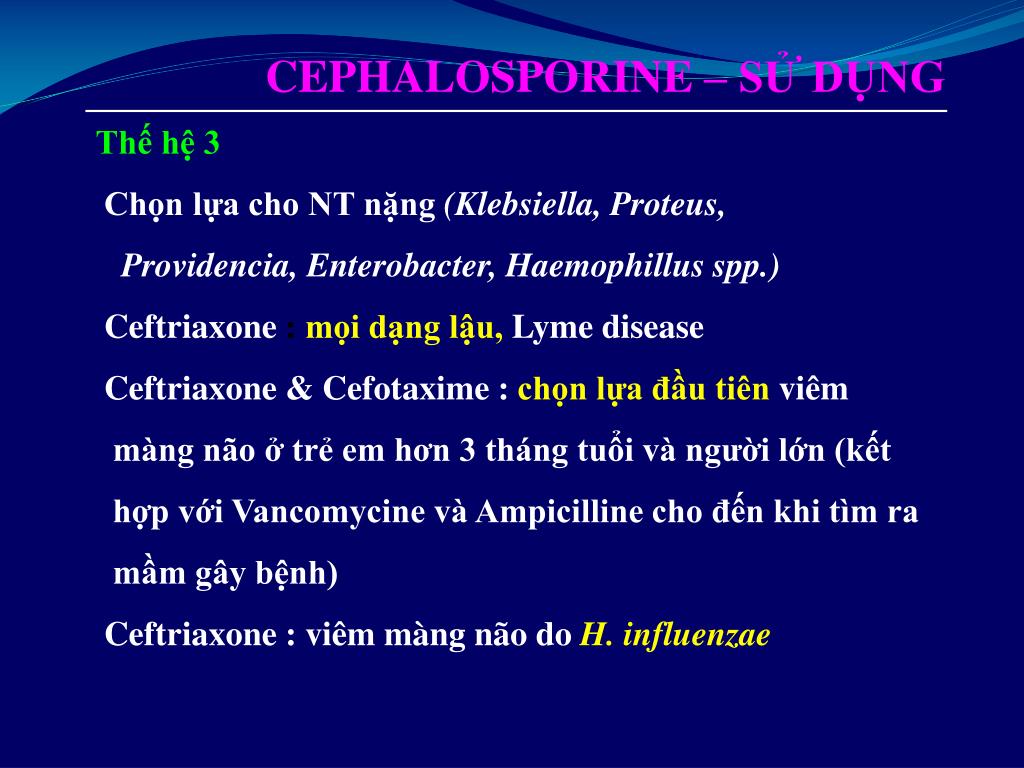 CEPHALOSPORINE – SỬ DỤNG Thế hệ 3 Chọn lựa cho NT nặng (Klebsiella, Proteus, Providencia, Enterobacter, Haemophillus spp.) Ceftriaxone : mọi dạng lậu, Lyme disease Ceftriaxone & Cefotaxime : chọn lựa đầu tiên viêm màng não ở trẻ em hơn 3 tháng tuổi và người lớn (kết hợp với Vancomycine và Ampicilline cho đến khi tìm ra mầm gây bệnh) Ceftriaxone : viêm màng não doH. influenzae
