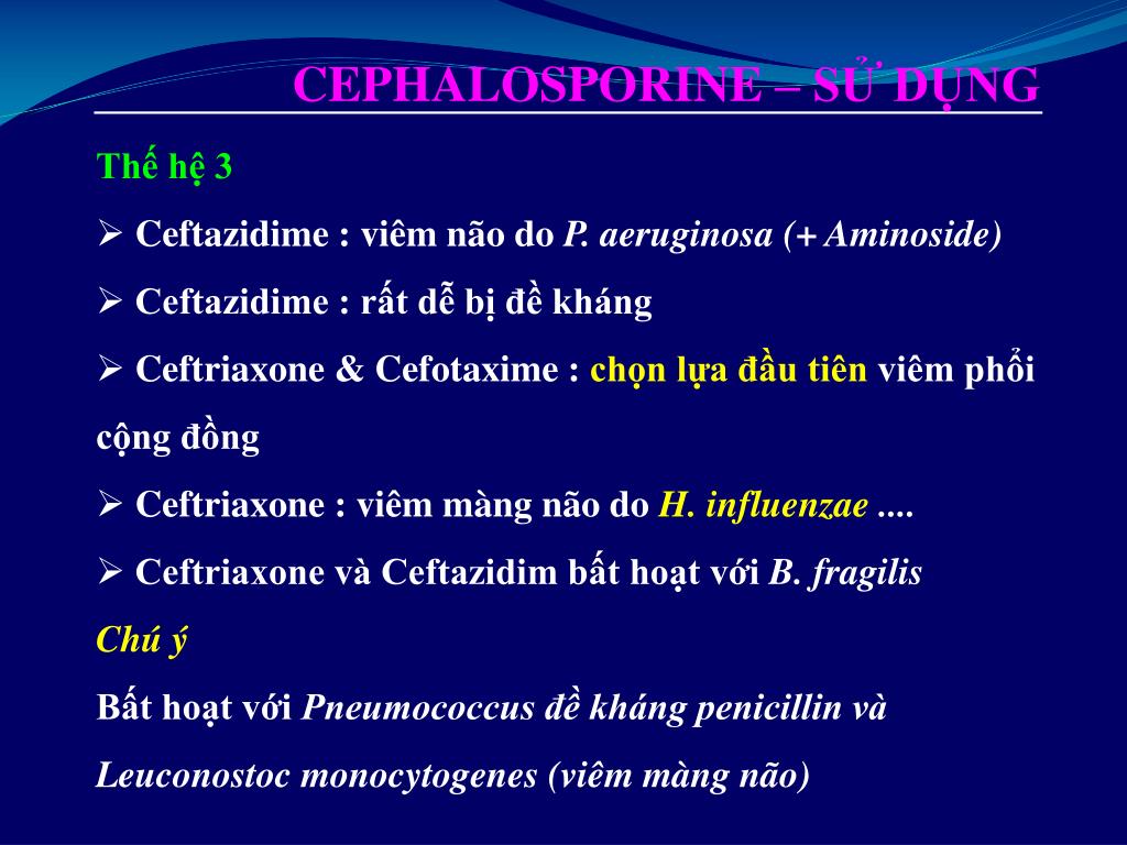 CEPHALOSPORINE – SỬ DỤNG • Thế hệ 3 • Ceftazidime : viêm não do P. aeruginosa (+ Aminoside) • Ceftazidime : rất dễ bị đề kháng • Ceftriaxone & Cefotaxime : chọn lựa đầu tiên viêm phổi cộng đồng • Ceftriaxone : viêm màng não do H. influenzae .... • Ceftriaxone và Ceftazidim bất hoạt với B. fragilis • Chú ý • Bất hoạt với Pneumococcus đề kháng penicillin và Leuconostoc monocytogenes (viêm màng não)