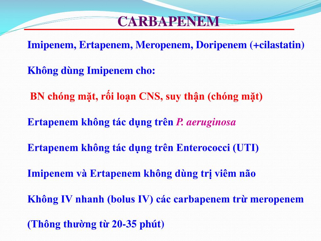 CARBAPENEM Imipenem, Ertapenem, Meropenem, Doripenem (+cilastatin) Không dùng Imipenem cho: BN chóng mặt, rối loạn CNS, suy thận (chóng mặt) Ertapenem không tác dụng trên P. aeruginosa Ertapenem không tác dụng trên Enterococci (UTI) Imipenem và Ertapenem không dùng trị viêm não Không IV nhanh (bolus IV) các carbapenem trừ meropenem (Thông thường từ 20-35 phút)