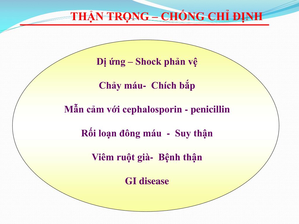 THẬN TRỌNG – CHỐNG CHỈ ĐỊNH Dị ứng – Shock phản vệ Chảy máu- Chích bắp Mẫn cảm với cephalosporin - penicillin Rối loạn đông máu - Suy thận Viêm ruột già- Bệnh thận GI disease
