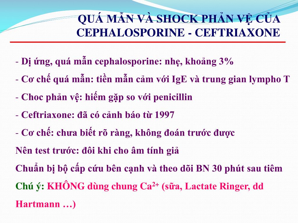 QUÁ MẪN VÀ SHOCK PHẢN VỆ CỦA CEPHALOSPORINE - CEFTRIAXONE • Dị ứng, quá mẫn cephalosporine: nhẹ, khoảng 3% • Cơ chế quá mẫn: tiền mẫn cảm với IgE và trung gian lympho T • Choc phản vệ: hiếm gặp so với penicillin • Ceftriaxone: đã có cảnh báo từ 1997 • Cơ chế: chưa biết rõ ràng, không đoán trước được • Nên test trước: đôi khi cho âm tính giả • Chuẩn bị bộ cấp cứu bên cạnh và theo dõi BN 30 phút sau tiêm • Chú ý: KHÔNG dùng chung Ca2+ (sữa, Lactate Ringer, dd Hartmann …)