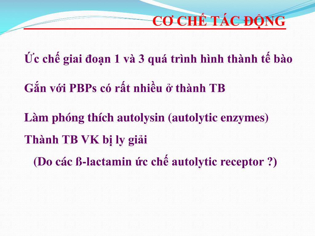 CƠ CHẾ TÁC ĐỘNG Ức chế giai đoạn 1 và 3 quá trình hình thành tế bào Gắn với PBPs có rất nhiều ở thành TB Làm phóng thích autolysin (autolytic enzymes) Thành TB VK bị ly giải (Do các ß-lactamin ức chế autolytic receptor ?)