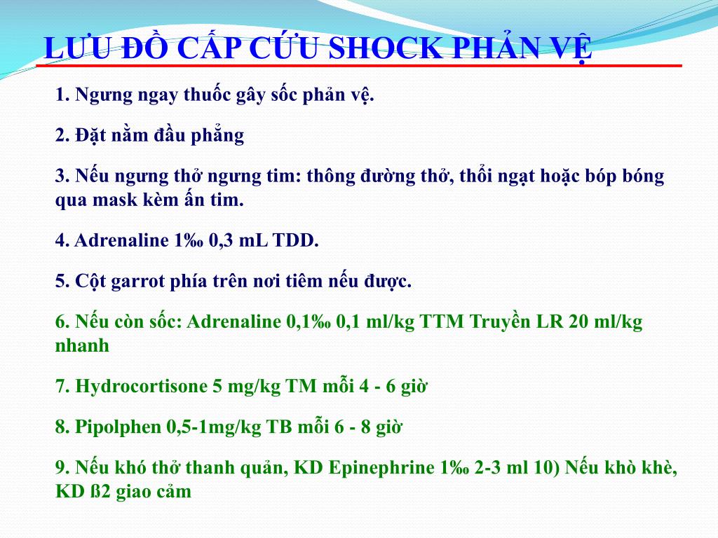 LƯU ĐỒ CẤP CỨU SHOCK PHẢN VỆ 1. Ngưng ngay thuốc gây sốc phản vệ. 2. Đặt nằm đầu phẳng 3. Nếu ngưng thở ngưng tim: thông đường thở, thổi ngạt hoặc bóp bóng qua mask kèm ấn tim. 4. Adrenaline 1‰ 0,3 mL TDD. 5. Cột garrot phía trên nơi tiêm nếu được. 6. Nếu còn sốc: Adrenaline 0,1‰ 0,1 ml/kg TTM Truyền LR 20 ml/kg nhanh 7. Hydrocortisone 5 mg/kg TM mỗi 4 - 6 giờ 8. Pipolphen 0,5-1mg/kg TB mỗi 6 - 8 giờ 9. Nếu khó thở thanh quản, KD Epinephrine 1‰ 2-3 ml 10) Nếu khò khè, KD ß2 giao cảm