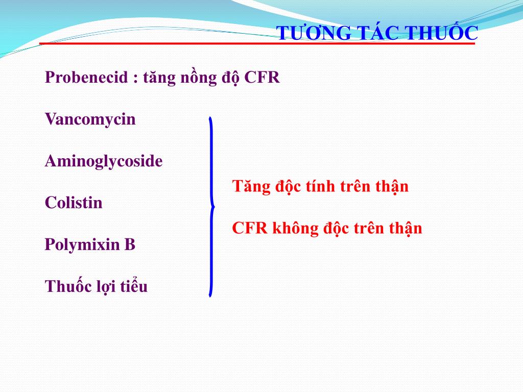 TƯƠNG TÁC THUỐC Probenecid : tăng nồng độ CFR Vancomycin Aminoglycoside Colistin Polymixin B Thuốc lợi tiểu Tăng độc tính trên thận CFR không độc trên thận