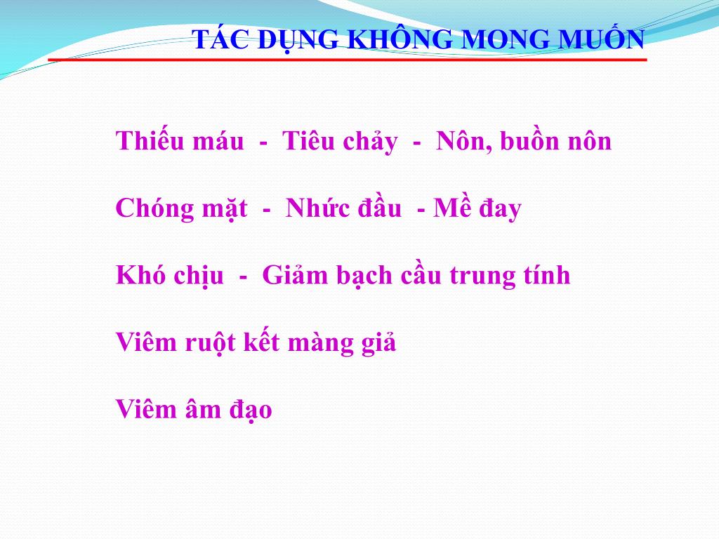 TÁC DỤNG KHÔNG MONG MUỐN Thiếu máu - Tiêu chảy - Nôn, buồn nôn Chóng mặt - Nhức đầu - Mề đay Khó chịu - Giảm bạch cầu trung tính Viêm ruột kết màng giả Viêm âm đạo