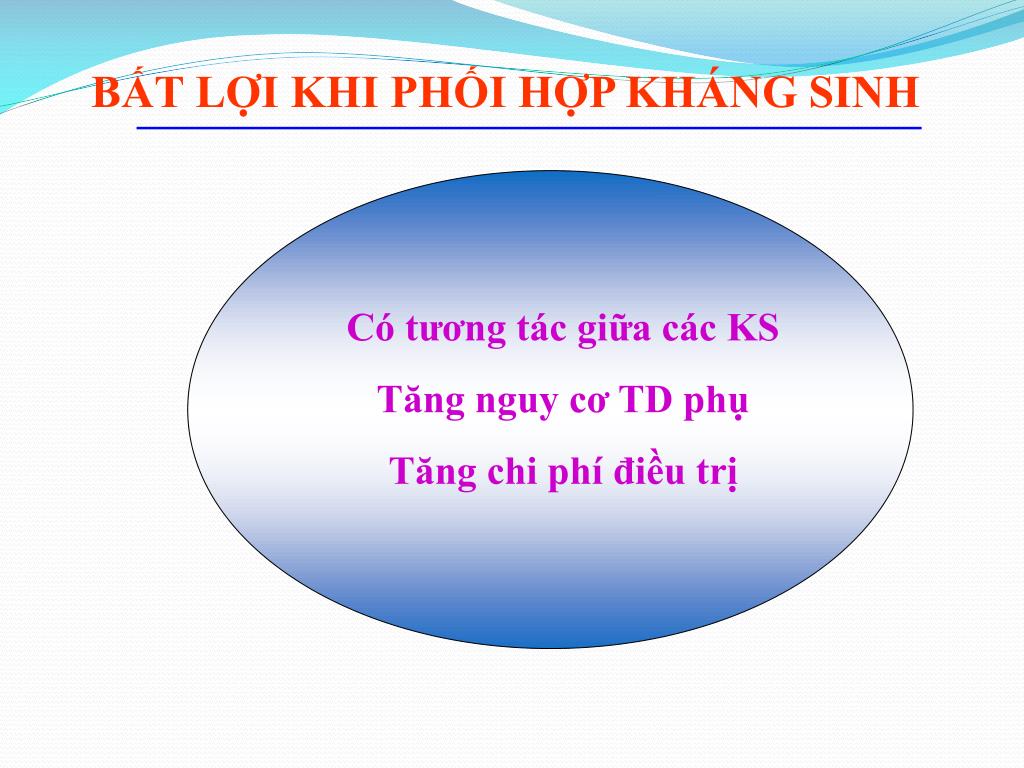 BẤT LỢI KHI PHỐI HỢP KHÁNG SINH Có tương tác giữa các KS Tăng nguy cơ TD phụ Tăng chi phí điều trị