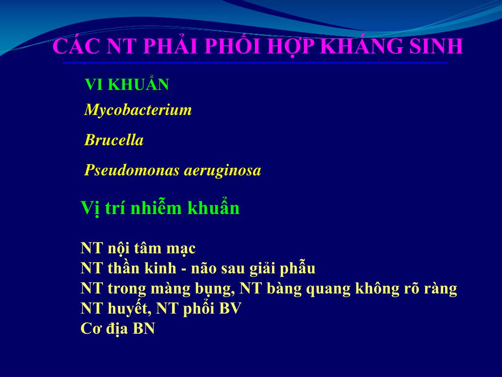 CÁC NT PHẢI PHỐI HỢP KHÁNG SINH VI KHUẨN Mycobacterium Brucella Pseudomonas aeruginosa Vị trí nhiễm khuẩn NT nội tâm mạc NT thần kinh - não sau giải phẫu NT trong màng bụng, NT bàng quang không rõ ràng NT huyết, NT phổi BV Cơ địa BN