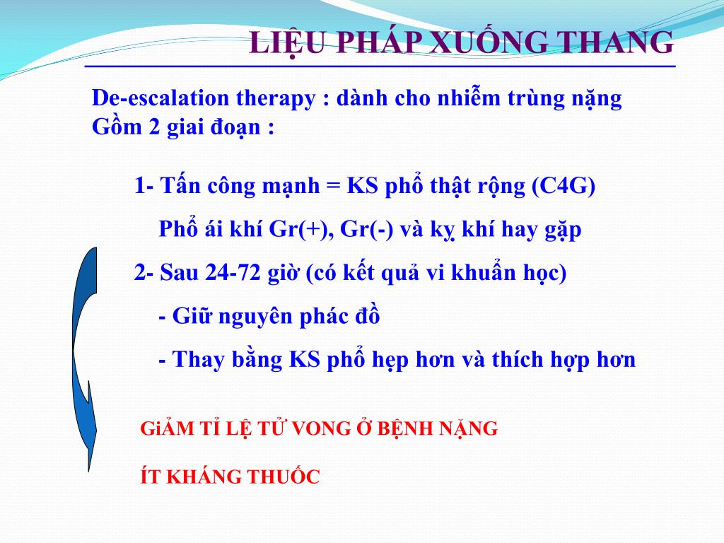 LIỆU PHÁP XUỐNG THANG De-escalation therapy : dành cho nhiễm trùng nặng Gồm 2 giai đoạn : 1- Tấn công mạnh = KS phổ thật rộng (C4G) Phổ ái khí Gr(+), Gr(-) và kỵ khí hay gặp 2- Sau 24-72 giờ (có kết quả vi khuẩn học) - Giữ nguyên phác đồ - Thay bằng KS phổ hẹp hơn và thích hợp hơn GiẢM TỈ LỆ TỬ VONG Ở BỆNH NẶNG ÍT KHÁNG THUỐC
