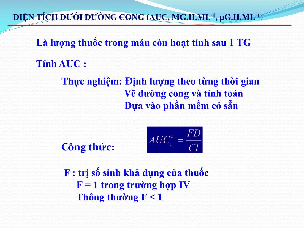 DIỆN TÍCH DƯỚI ĐƯỜNG CONG (AUC, MG.H.ML-1, G.H.ML-1) Là lượng thuốc trong máu còn hoạt tính sau 1 TG Tính AUC : Thực nghiệm: Định lượng theo từng thời gian Vẽ đường cong và tính toán Dựavàophầnmềmcósẵn Côngthức: F : trị số sinh khả dụng của thuốc F = 1 trong trường hợp IV Thông thường F < 1