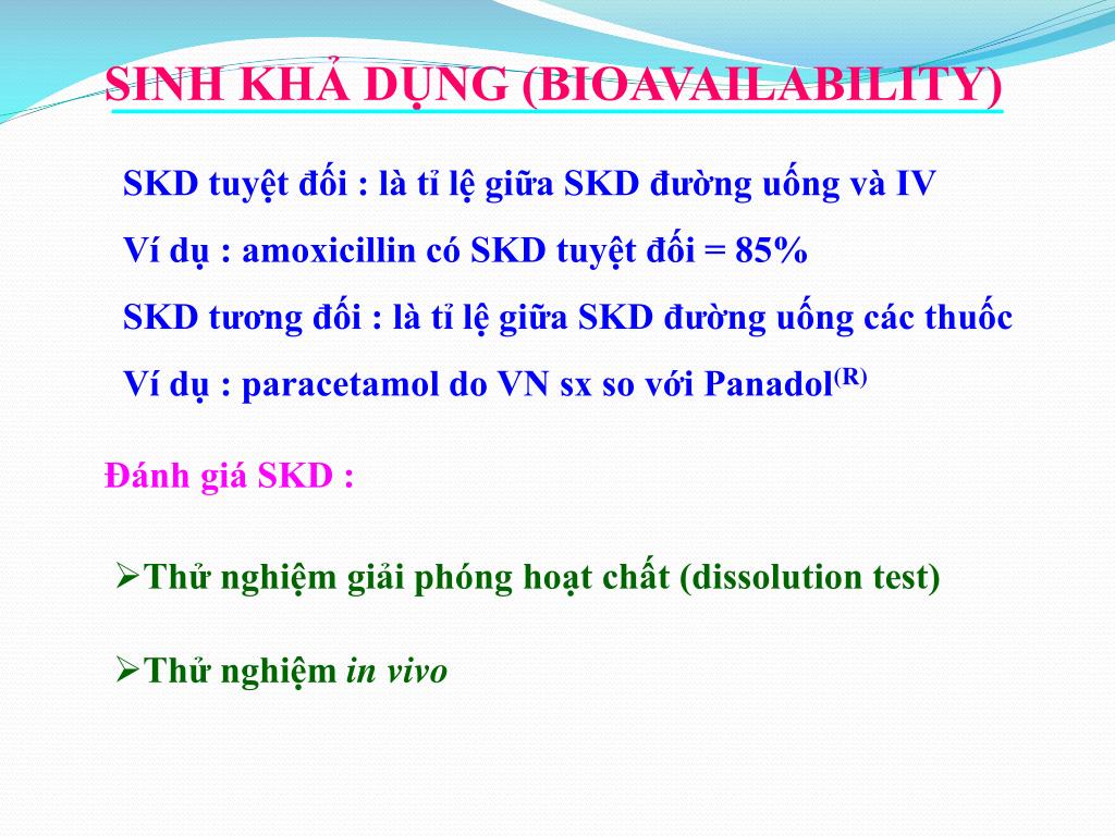 SINH KHẢ DỤNG (BIOAVAILABILITY) SKD tuyệt đối : là tỉ lệ giữa SKD đường uống và IV Ví dụ : amoxicillin có SKD tuyệt đối = 85% SKD tương đối : là tỉ lệ giữa SKD đường uống các thuốc Ví dụ : paracetamol do VN sx so với Panadol(R) Đánh giá SKD : • Thử nghiệm giải phóng hoạt chất (dissolution test) • Thử nghiệm in vivo