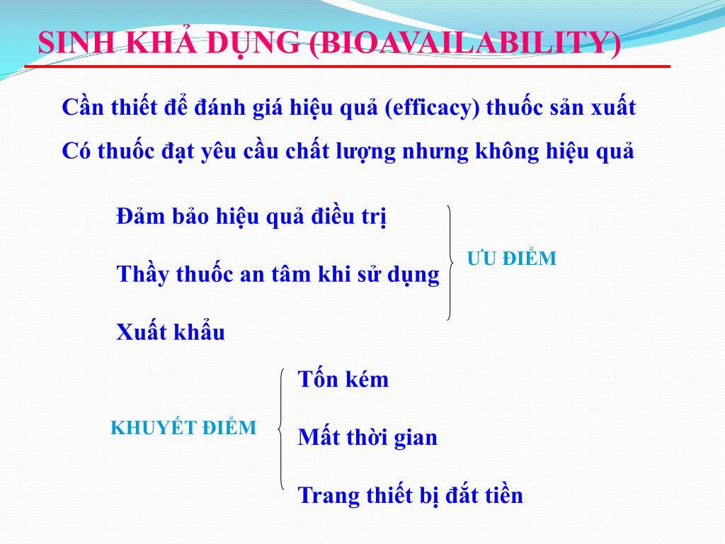 SINH KHẢ DỤNG (BIOAVAILABILITY) Cần thiết để đánh giá hiệu quả (efficacy) thuốc sản xuất Có thuốc đạt yêu cầu chất lượng nhưng không hiệu quả Đảm bảo hiệu quả điều trị Thầy thuốc an tâm khi sử dụng Xuất khẩu ƯU ĐIỂM Tốn kém Mất thời gian Trang thiết bị đắt tiền KHUYẾT ĐIỂM