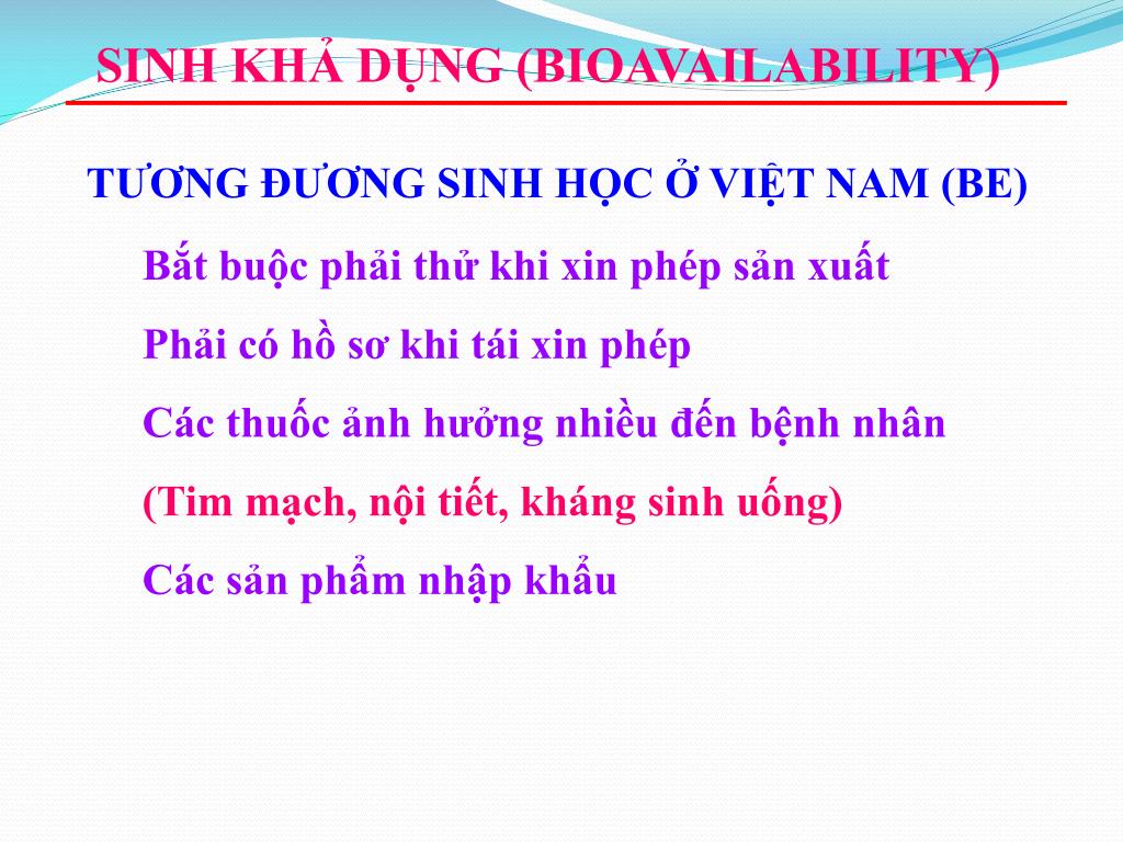 SINH KHẢ DỤNG (BIOAVAILABILITY) TƯƠNG ĐƯƠNG SINH HỌC Ở VIỆT NAM (BE) Bắt buộc phải thử khi xin phép sản xuất Phải có hồ sơ khi tái xin phép Các thuốc ảnh hưởng nhiều đến bệnh nhân (Tim mạch, nội tiết, kháng sinh uống) Các sản phẩm nhập khẩu