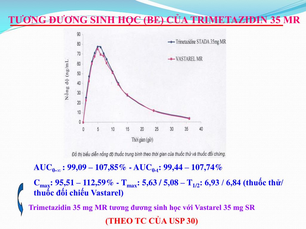 TƯƠNG ĐƯƠNG SINH HỌC (BE) CỦA TRIMETAZIDIN 35 MR AUC0-∞: 99,09 – 107,85% - AUC0-t: 99,44 – 107,74% Cmax: 95,51 – 112,59% - Tmax: 5,63 / 5,08 – T1/2: 6,93 / 6,84 (thuốc thử/ thuốc đối chiếu Vastarel) Trimetazidin 35 mg MR tương đương sinh học với Vastarel 35 mg SR (THEO TC CỦA USP 30)