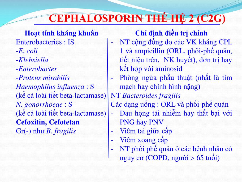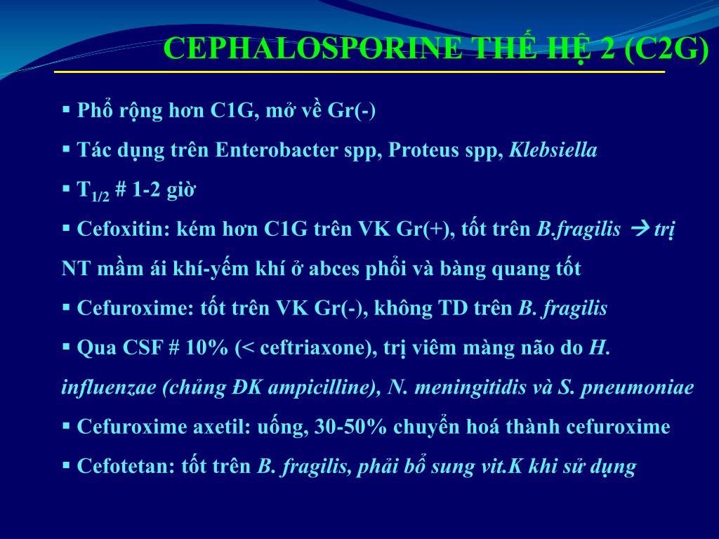 CEPHALOSPORINE THẾ HỆ 2 (C2G) • Phổ rộng hơn C1G, mở về Gr(-) • Tác dụng trên Enterobacter spp, Proteus spp, Klebsiella • T1/2 # 1-2 giờ • Cefoxitin: kém hơn C1G trên VK Gr(+), tốt trên B.fragilis trị NT mầm ái khí-yếm khí ở abces phổi và bàng quang tốt • Cefuroxime: tốt trên VK Gr(-), không TD trên B. fragilis • Qua CSF # 10% (< ceftriaxone), trị viêm màng não do H. influenzae (chủng ĐK ampicilline), N. meningitidis và S. pneumoniae • Cefuroxime axetil: uống, 30-50% chuyển hoá thành cefuroxime • Cefotetan: tốt trên B. fragilis, phải bổ sung vit.K khi sử dụng