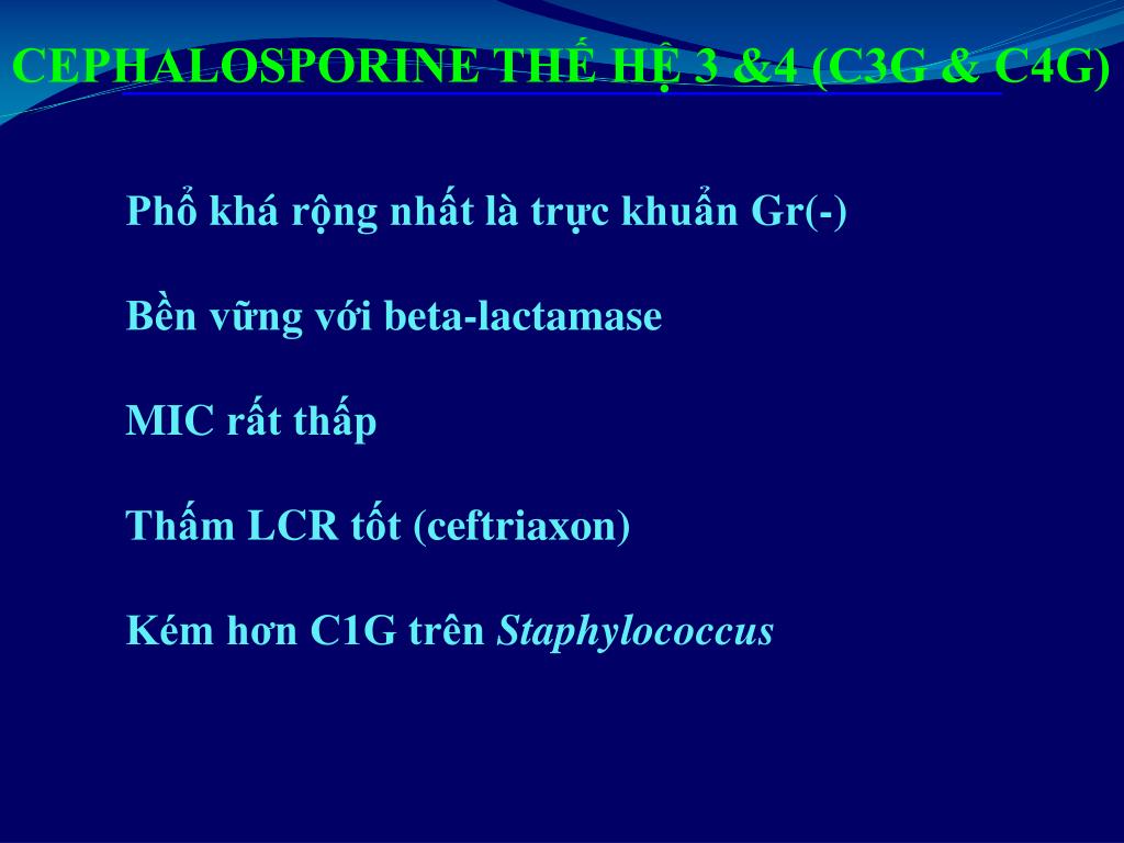 CEPHALOSPORINE THẾ HỆ 3 &4 (C3G & C4G) PhổkhárộngnhấtlàtrựckhuẩnGr(-) Bềnvữngvới beta-lactamase MIC rấtthấp Thấm LCR tốt (ceftriaxon) Kém hơn C1G trên Staphylococcus