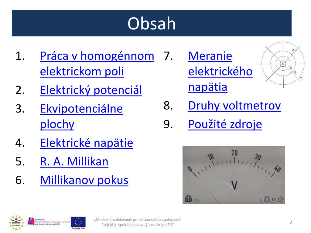 Obsah • Meranie elektrického napätia • Druhy voltmetrov • Použité zdroje • Práca v homogénnom elektrickom poli • Elektrický potenciál • Ekvipotenciálne plochy • Elektrické napätie • R. A. Millikan • Millikanov pokus