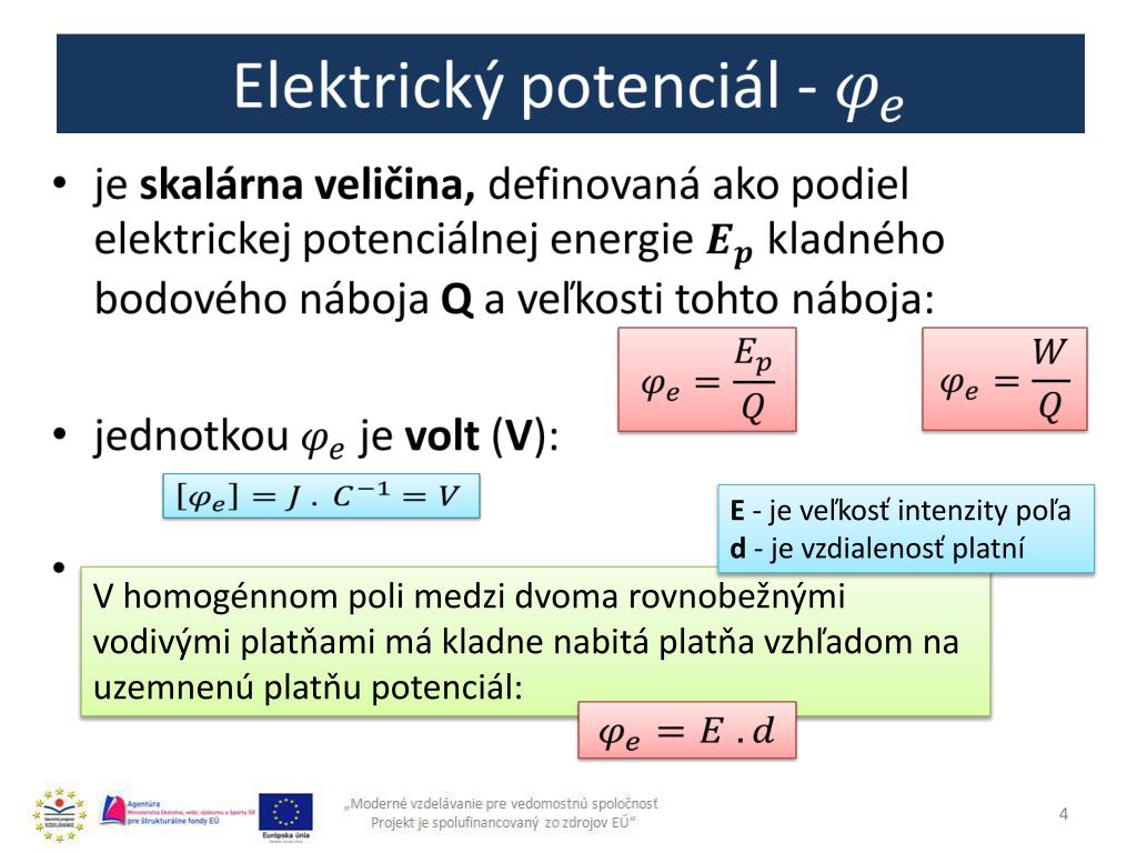 E - je veľkosť intenzity poľa d - je vzdialenosť platní V homogénnom poli medzi dvoma rovnobežnými vodivými platňami má kladne nabitá platňa vzhľadom na uzemnenú platňu potenciál: