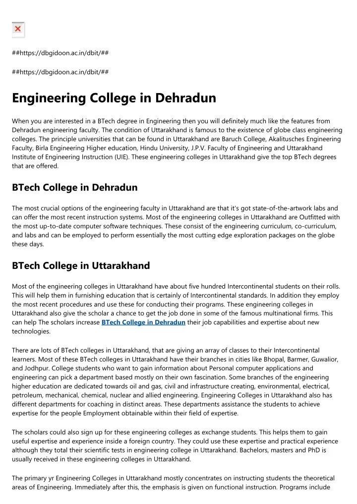 ##https://dbgidoon.ac.in/dbit/## ##https://dbgidoon.ac.in/dbit/## Engineering College in Dehradun When you are interested in a BTech degree in Engineering then you will definitely much like the features from Dehradun engineering faculty. The condition of Uttarakhand is famous to the existence of globe class engineering colleges. The principle universities that can be found in Uttarakhand are Baruch College, Akalitusches Engineering Faculty, Birla Engineering Higher education, Hindu University, J.P.V. Faculty of Engineering and Uttarakhand Institute of Engineering Instruction (UIE). These engineering colleges in Uttarakhand give the top BTech degrees that are offered. BTech College in Dehradun The most crucial options of the engineering faculty in Uttarakhand are that it's got state-of-the-artwork labs and can offer the most recent instruction systems. Most of the engineering colleges in Uttarakhand are Outfitted with the most up-to-date computer software techniques. These consist of the engineering curriculum, co-curriculum, and labs and can be employed to perform essentially the most cutting edge exploration packages on the globe these days. BTech College in Uttarakhand Most of the engineering colleges in Uttarakhand have about five hundred Intercontinental students on their rolls. This will help them in furnishing education that is certainly of Intercontinental standards. In addition they employ the most recent procedures and use these for conducting their programs. These engineering colleges in Uttarakhand also give the scholar a chance to get the job done in some of the famous multinational firms. This can help The scholars increase BTech College in Dehradun their job capabilities and expertise about new technologies. There are lots of BTech colleges in Uttarakhand, that are giving an array of classes to their Intercontinental learners. Most of these BTech colleges in Uttarakhand have their branches in cities like Bhopal, Barmer, Guwalior, and Jodhpur. College students who want to gain information about Personal computer applications and engineering can pick a department based mostly on their own fascination. Some branches of the engineering higher education are dedicated towards oil and gas, civil and infrastructure creating, environmental, electrical, petroleum, mechanical, chemical, nuclear and allied engineering. Engineering Colleges in Uttarakhand also has different departments for coaching in distinct areas. These departments assistance the students to achieve expertise for the people Employment obtainable within their field of expertise. The scholars could also sign up for these engineering colleges as exchange students. This helps them to gain useful expertise and experience inside a foreign country. They could use these expertise and practical experience although they total their scientific tests in engineering college in Uttarakhand. Bachelors, masters and PhD is usually received in these engineering colleges in Uttarakhand. The primary yr Engineering Colleges in Uttarakhand mostly concentrates on instructing students the theoretical areas of Engineering. Immediately after this, the emphasis is given on functional instruction. Programs include