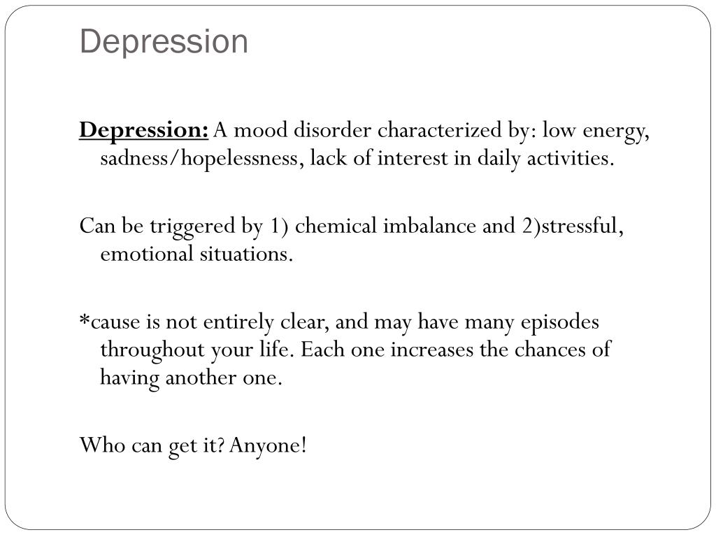Depression Depression: A mood disorder characterized by: low energy, sadness/hopelessness, lack of interest in daily activities. Can be triggered by 1) chemical imbalance and 2)stressful, emotional situations. *cause is not entirely clear, and may have many episodes throughout your life. Each one increases the chances of having another one. Who can get it? Anyone!