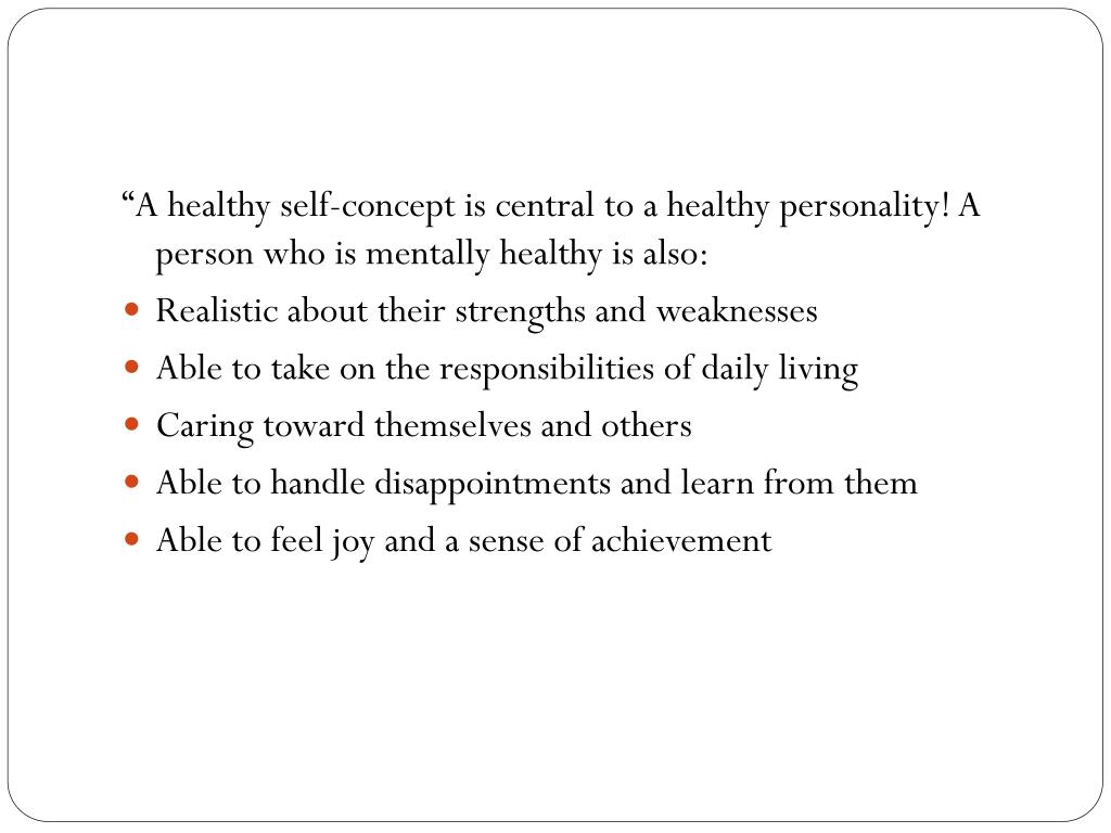 “A healthy self-concept is central to a healthy personality! A person who is mentally healthy is also: • Realistic about their strengths and weaknesses • Able to take on the responsibilities of daily living • Caring toward themselves and others • Able to handle disappointments and learn from them • Able to feel joy and a sense of achievement