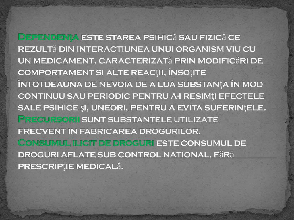 Drogul este acea substanţă care, odată absorbită de un organism viu, poate modifica una sau mai multe funcţii ale acestuia.Dependenţaeste starea psihică sau fizică ce rezultă din interactiunea unui organism viu cu un medicament, caracterizată prin modificări de comportament si alte reacţii, însoţite întotdeauna de nevoia de a lua substanţa în mod continuu sau periodic pentru a-i resimţi efectele sale psihice şi, uneori, pentru a evita suferinţele.Precursorii sunt substantele utilizate frecvent in fabricarea drogurilor.Consumul ilicit de droguri este consumul de droguri aflate sub control national, fără prescripţie medicală.