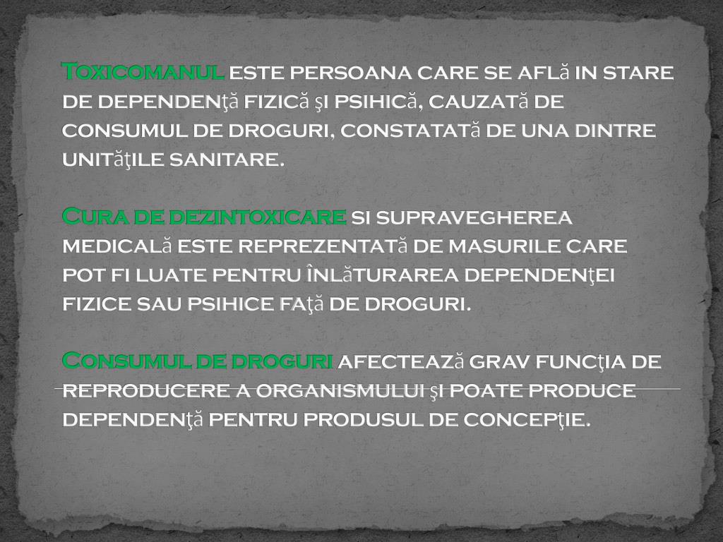 Toxicomanul este persoana care se află in stare de dependenţă fizică şi psihică, cauzată de consumul de droguri, constatată de una dintre unităţile sanitare. Cura de dezintoxicare si supravegherea medicală este reprezentată de masurile care pot fi luate pentru înlăturarea dependenţei fizice sau psihice faţă de droguri. Consumul de droguri afectează grav funcţia de reproducere a organismului şi poate produce dependenţă pentru produsul de concepţie.