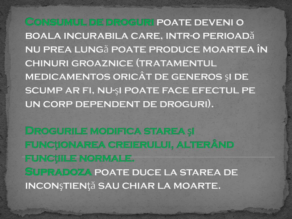 Consumul de droguri poate deveni o boala incurabila care, intr-o perioadă nu prea lungă poate produce moartea în chinuri groaznice (tratamentul medicamentos oricât de generos şi de scump ar fi, nu-şi poate face efectul pe un corp dependent de droguri).Drogurile modifica starea şi funcţionarea creierului, alterând funcţiile normale.Supradozapoate duce la starea de inconştienţă sau chiar la moarte.
