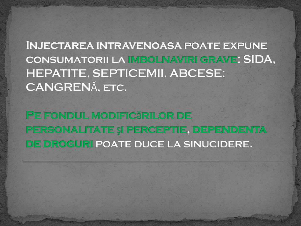 Injectarea intravenoasa poate expune consumatorii la imbolnaviri grave: SIDA, HEPATITE, SEPTICEMII, ABCESE; CANGRENĂ, etc.Pe fondul modificărilor de personalitate şi perceptie, dependentade droguri poate duce la sinucidere.