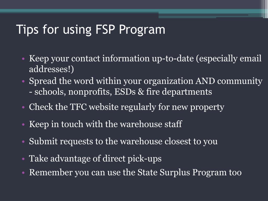 Tips for using FSP Program • Keep your contact information up-to-date (especially email addresses!) • Spread the word within your organization AND community - schools, nonprofits, ESDs & fire departments • Check the TFC website regularly for new property • Keep in touch with the warehouse staff • Submit requests to the warehouse closest to you • Take advantage of direct pick-ups • Remember you can use the State Surplus Program too
