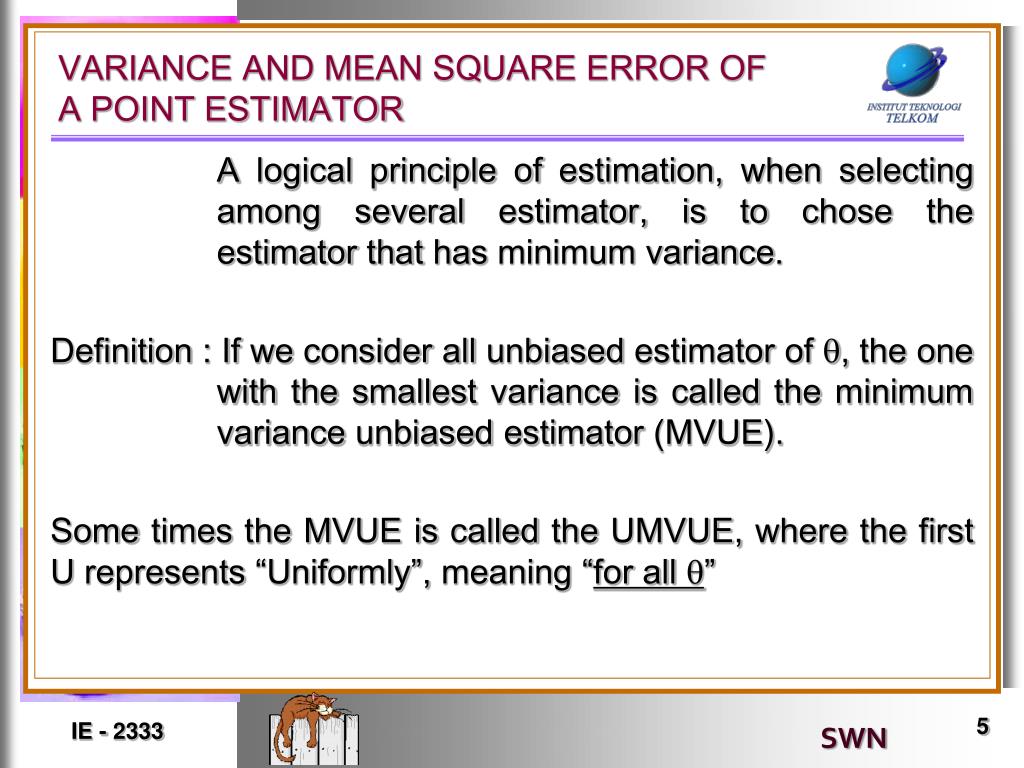VARIANCE AND MEAN SQUARE ERROR OF A POINT ESTIMATOR A logical principle of estimation, when selecting among several estimator, is to chose the estimator that has minimum variance. Definition : If we consider all unbiased estimator of , the one with the smallest variance is called the minimum variance unbiased estimator (MVUE). Some times the MVUE is called the UMVUE, where the first U represents “Uniformly”, meaning “for all ”