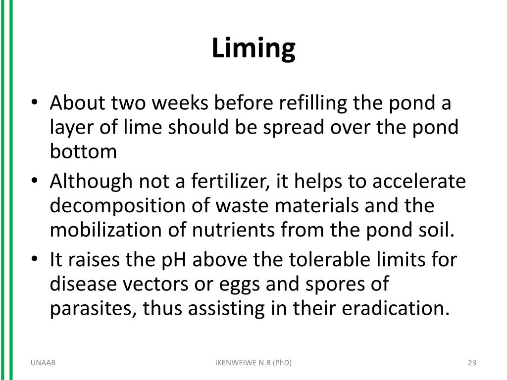 Liming • About two weeks before refilling the pond a layer of lime should be spread over the pond bottom • Although not a fertilizer, it helps to accelerate decomposition of waste materials and the mobilization of nutrients from the pond soil. • It raises the pH above the tolerable limits for disease vectors or eggs and spores of parasites, thus assisting in their eradication. IKENWEIWE N.B (PhD)