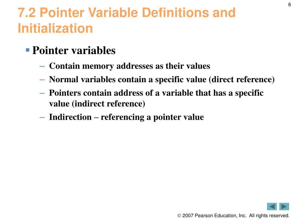 7.2 Pointer Variable Definitions and Initialization • Pointer definitions • * used with pointer variables • int *myPtr; • Defines a pointer to an int (pointer of type int *) • Multiple pointers require using a * before each variable definition • int *myPtr1, *myPtr2; • Can define pointers to any data type • Initialize pointers to 0, NULL, or an address • 0 or NULL– points to nothing (NULL preferred)