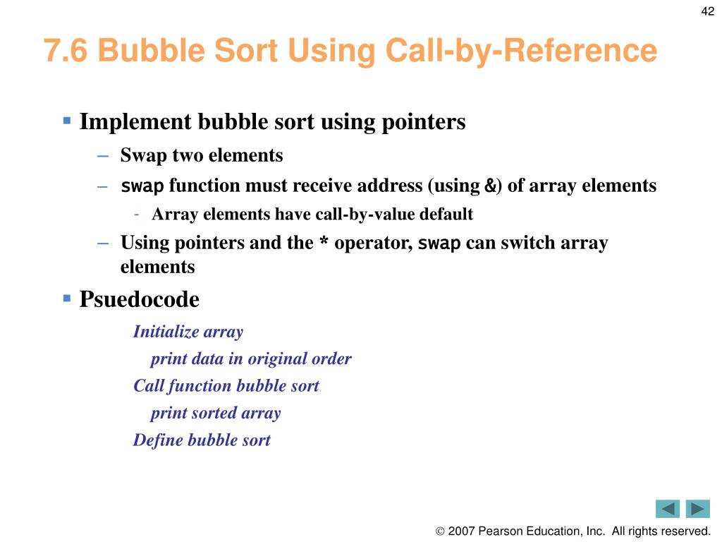 7.6 Bubble Sort Using Call-by-Reference • Implement bubble sort using pointers • Swap two elements • swap function must receive address (using &) of array elements • Array elements have call-by-value default • Using pointers and the * operator, swap can switch array elements • Psuedocode Initialize array print data in original order Call function bubble sort print sorted array Define bubble sort