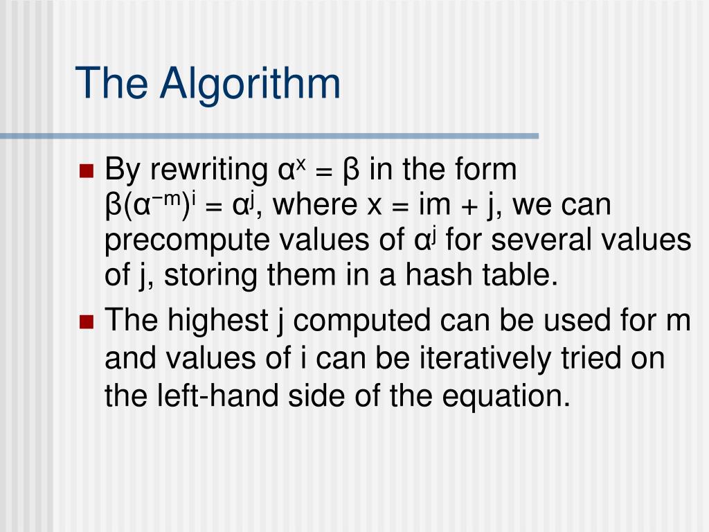 The Algorithm • By rewriting αx = β in the form β(α−m)i = αj, where x = im + j, we can precompute values of αj for several values of j, storing them in a hash table. • The highest j computed can be used for m and values of i can be iteratively tried on the left-hand side of the equation.